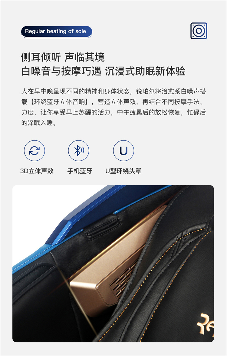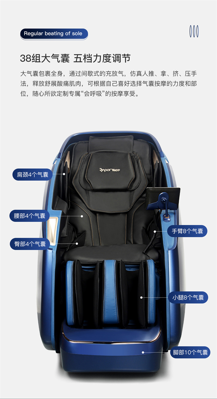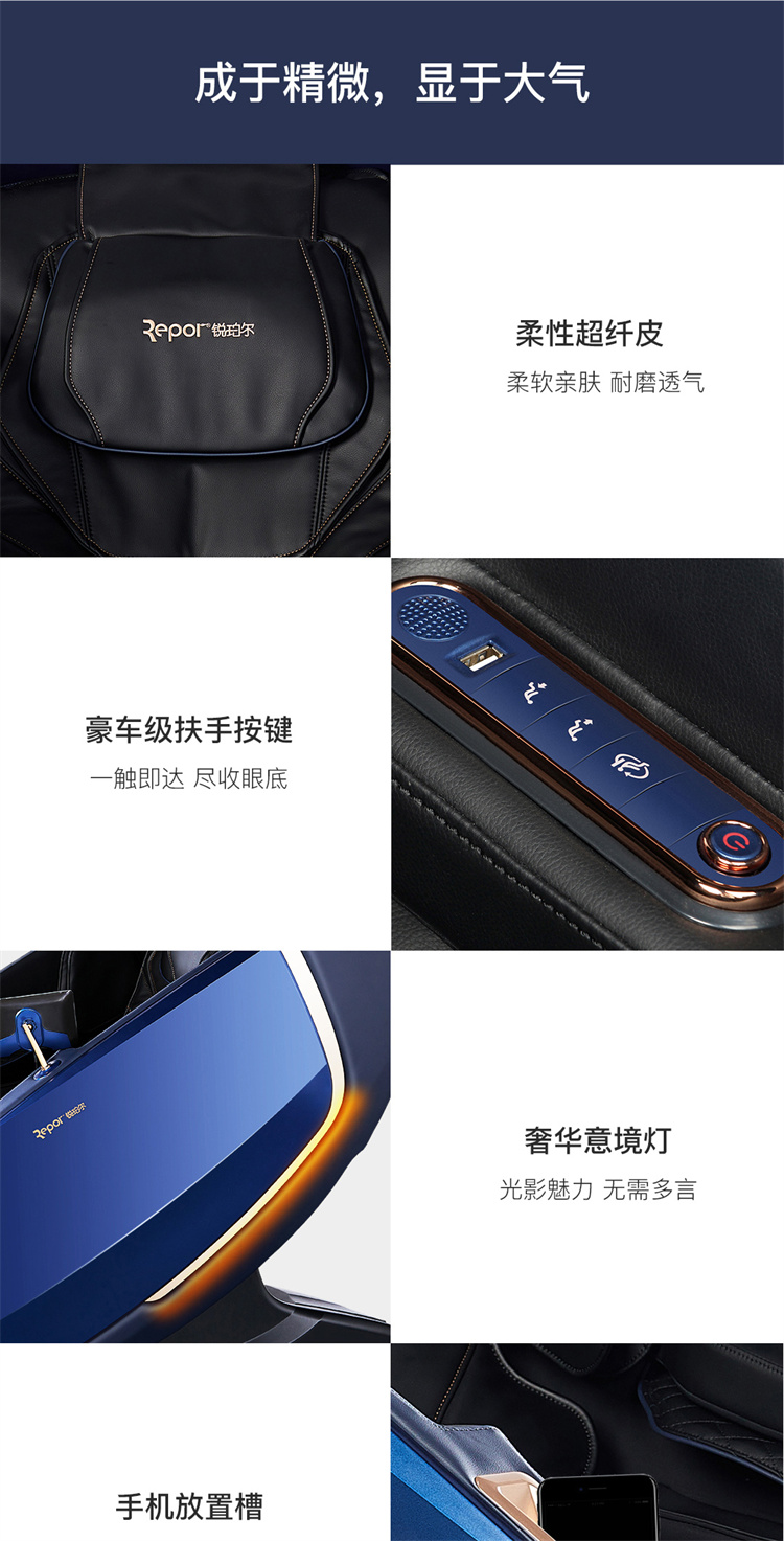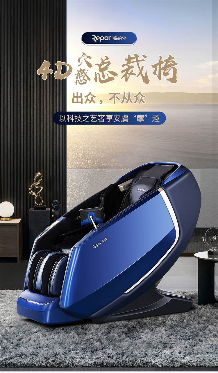 • 產(chǎn)品簡介:銳珀爾集十余年技術(shù)積累,傾力打造銳珀爾新款按摩椅4D穴感總裁椅,擁有全新的AI智能語音,小腿溫?zé)崛啻辍⒛_底震動、4D機械手等全新功能創(chuàng)新,智能健康體測,可以檢測血氧、心率、微循環(huán)等數(shù)值,通過大數(shù)據(jù)分析,給您提供合理的改善方法,時刻關(guān)注您的健康狀況;超大液晶智能觸控,專為總裁量身打造的特色按摩程序,20分鐘快速補充精力,多種按摩程序,滿足全家人的需求。