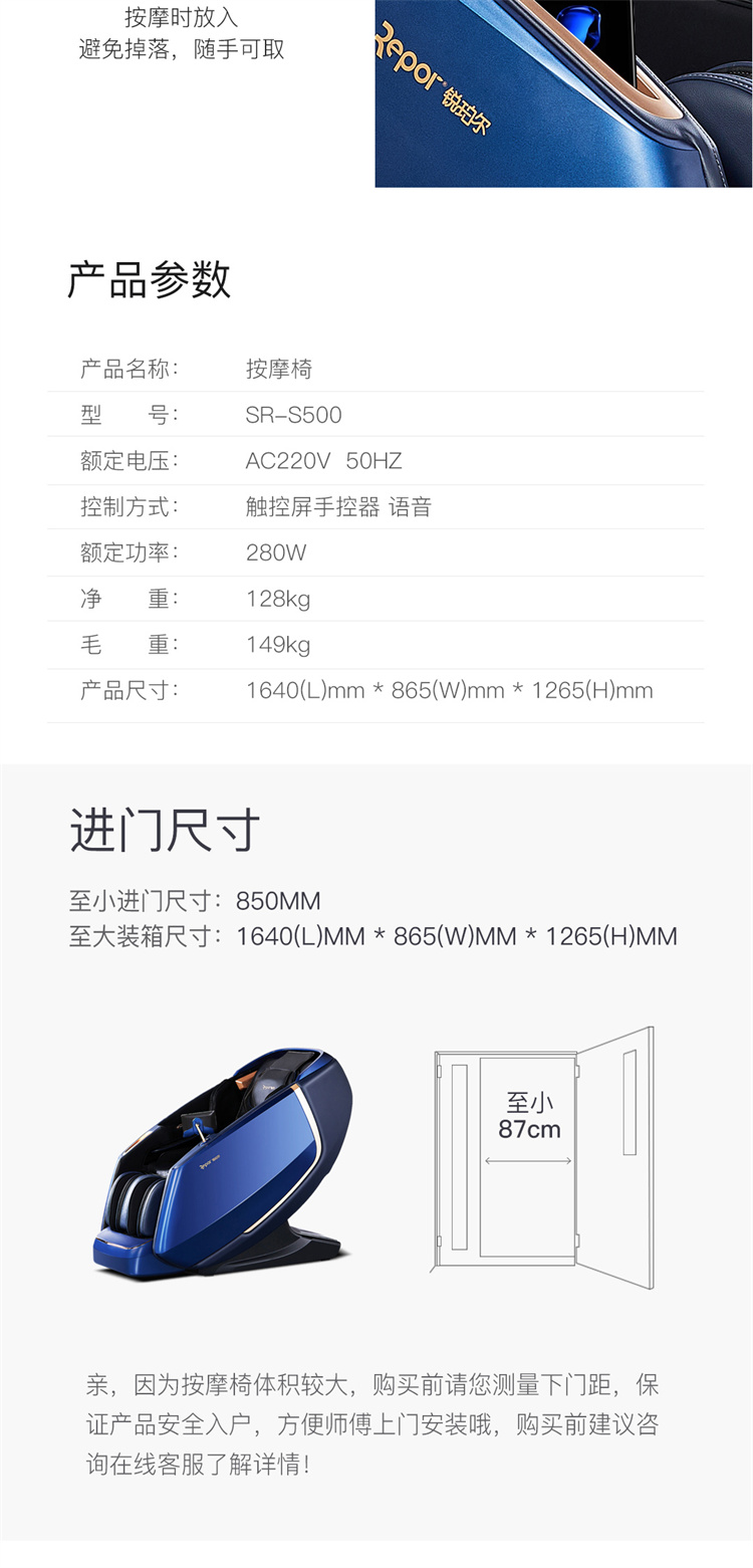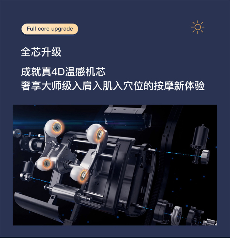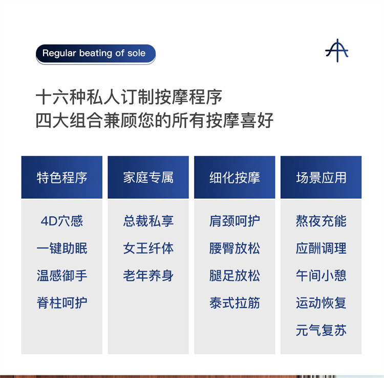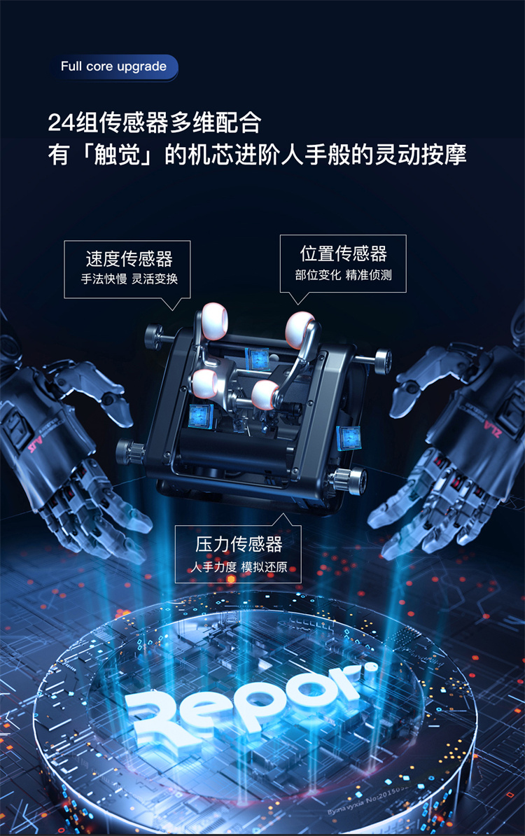 • 產(chǎn)品簡介:銳珀爾集十余年技術(shù)積累,傾力打造銳珀爾新款按摩椅4D穴感總裁椅,擁有全新的AI智能語音,小腿溫?zé)崛啻辍⒛_底震動、4D機械手等全新功能創(chuàng)新,智能健康體測,可以檢測血氧、心率、微循環(huán)等數(shù)值,通過大數(shù)據(jù)分析,給您提供合理的改善方法,時刻關(guān)注您的健康狀況;超大液晶智能觸控,專為總裁量身打造的特色按摩程序,20分鐘快速補充精力,多種按摩程序,滿足全家人的需求。