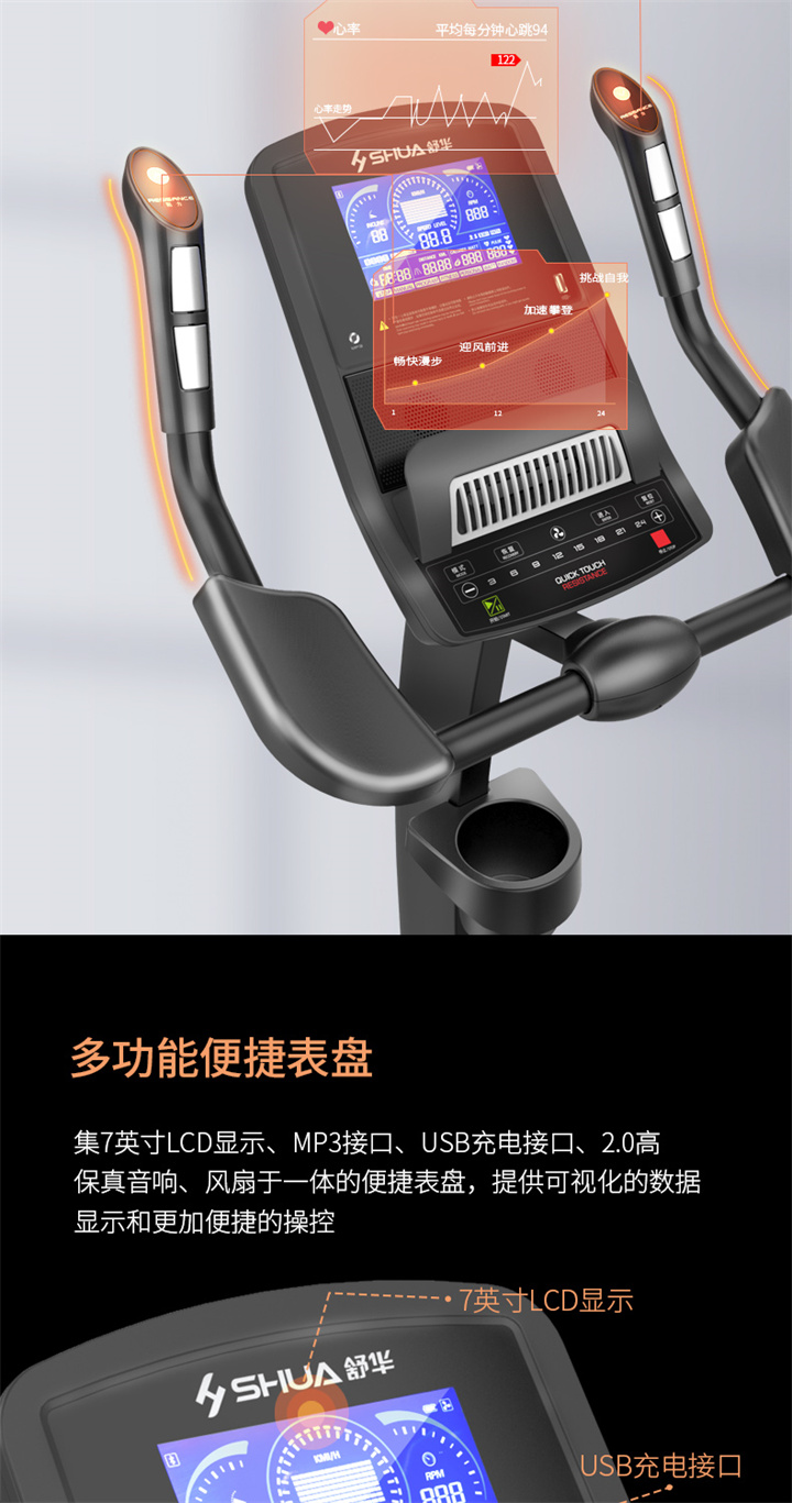 舒華立式商用健身車SH-B9100U(V10)觸屏版擁有超大顯示和操作屏幕, 可以任意設(shè)置阻力、時(shí)間和距離等參數(shù),還可以即時(shí)顯示心跳和轉(zhuǎn)速等數(shù)據(jù),同時(shí),SH-B9100U提供多項(xiàng)科學(xué)運(yùn)動(dòng)處方,更輕松掌握運(yùn)動(dòng)節(jié)奏。