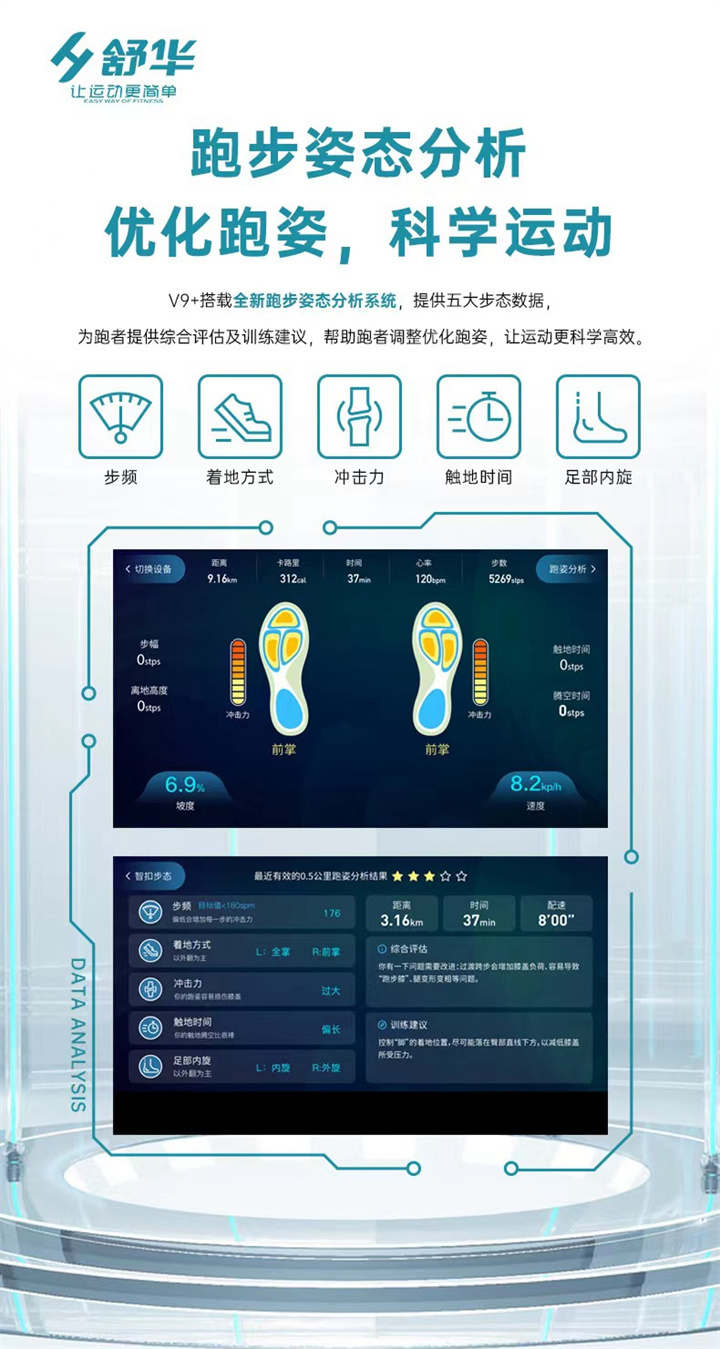 智能商用跑步機SH-T8919T-Y50(V9+)全跑臺減震設(shè)計,跑臺尺寸達580×1570mm,馬達采用3.0CP,配備21.5寸大屏,速度范圍0.8—20km/h,坡度也可以-3—15%,可承受180kg的使用者使用。
