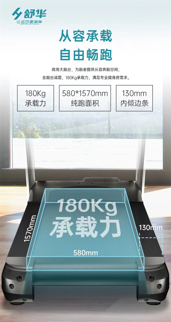 舒華商用跑步機SH-T8919采用t2.2mm黑鉆紋(可選配:t2.4免維護跑帶)的跑帶,,選用手握心率測試 自帶心率帶及增加心率控速(HRC)程序模塊、接觸式心率感應(yīng)測量心跳等數(shù)據(jù),跑步面積達580×1570mm,可承受180kg的使用者使用。